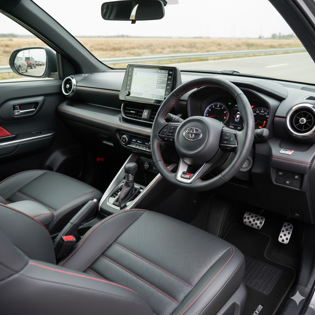 Kursi semi-bucket memberikan dukungan ekstra saat bermanuver cepat, sementara setir berbalut kulit dengan logo GR mempertegas aura performa.